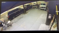 A security camera video showed the truck clip a scooter, then swerve onto a sidewalk and nearly plow into a pedestrian, who dived to safety just in time. A police patrol car then followed the truck down the sidewalk at high speed.