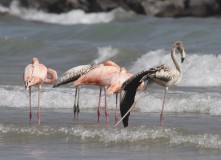 PORT WASHINGTON, Wis. (AP) — Five flamingos that showed up in Wisconsin to wade along a Lake Michigan beach attracted a big crowd of onlookers eager to see the unusual visitors venturing far from their usual tropical setting.