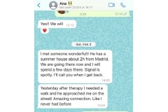 That was followed a minute later by a second text: “Yesterday after therapy I needed a walk and he approached me on the street! Amazing connection. Like I never had.”