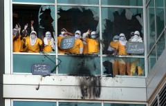 Video posted on social media by passersby showed inmates standing near three windows on the fourth floor that had been smashed out. Some carried signs or tossed items, some ablaze, to the sidewalk below. Firefighters used a hose to put out the fires.
