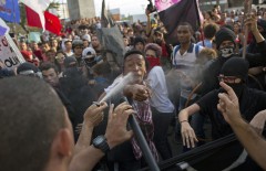 Brazilian riot police have used tear gas and pepper spray to disperse protesters in the path of the Olympic torch relay north of Rio de Janeiro. The military police have not responded to immediate requests for information.