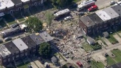 BALTIMORE (AP) — A “major gas explosion” completely destroyed three row houses in Baltimore on Monday, killing a woman, injuring several other people and trapping at least one person in the wreckage, firefighters said.