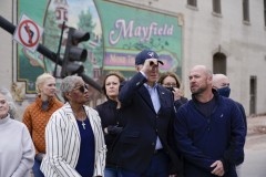 Earlier, in Mayfield, the president held hands in prayer with Graves County Executive Jesse Perry and a pastor. A family that had gathered in front of a destroyed home talked with Biden, who told reporters he was “impressed how everybody is working together” on the recovery. On Mayfield’s main street, Biden spoke with two women in a shattered building. They had a sign that said, “God is good. Beaten but not defeated.”