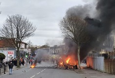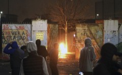 The focus of the violence, some of it committed by youths in their early teens, was a concrete “peace wall” in west Belfast that separates a British loyalist Protestant neighborhood from an Irish nationalist Catholic area. The two sides clashed across the wall, while nearby a city bus was hijacked and set on fire.