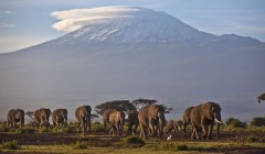 FILE - In this Monday, Dec. 17, 2012 file photo, a herd of adult and baby elephants walks in the dawn light as the highest mountain in Africa, Mount Kilimanjaro in Tanzania, sits topped with snow in the background, seen from Amboseli National Park in southern Kenya. Africa's rare glaciers will disappear...   (Associated Press)