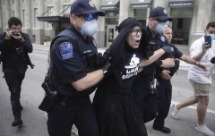 A woman who was arrested on live television was seen sitting cross-legged on the ground in peaceful protest when officers pulled her away by the arms and later put her in handcuffs. She said her name was Sheila Buck and that she was from Tulsa.