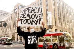 There was a protest outside of Twitter's headquarters building in San Francisco, but it was lightly attended. The building itself is largely empty because executives and employees have been working remotely for almost a year due to the pandemic.