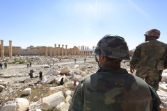 It was completely deserted on Friday, except for Syrian army soldiers working on dismantling explosives and visiting journalists. The town — about a kilometer away from the ruins — is completely deserted, its remaining residents had fled as the Syrian army's offensive against IS began a month ago.