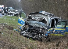 The dpa news agency, citing police, reported that three people in a police vehicle were seriously injured in the traffic crash while the two people in the other car died.