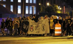The Atlanta Journal-Constitution reports that a lone policeman at Piedmont Park on Sunday night was surrounded by black-clad protesters shouting "pig" as demonstrators used chains to try and destroy the Peace Monument.