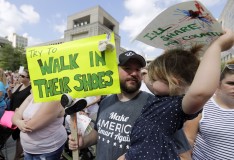 Protesters carried signs saying, "Try to walk in their shoes," ''We are all immigrants" and "Families belong together." The rally Saturday is among hundreds across the U.S. urging the Trump administration to reunite families separated at the U.S.-Mexico border.