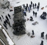 The coach-style bus landed upside down on the ice, collapsing the passenger compartment.