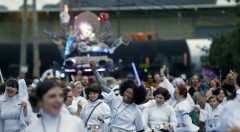 The parade was led by the Leijorettes, followed by a brass band playing the "Star Wars" theme as hundreds of people — many in costume or carrying light sabers — walked behind them. Fans lined the road, taking photos.