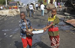 Parts of the busy Hodan district were flattened, with concrete buildings mangled. Cars burned. Bodies were rushed away by shaken survivors, with bloodied sandals left behind. Children carried away charred remains in cardboard boxes.
