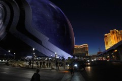 Las Vegas police said they began receiving calls about a person climbing the 366-foot-tall (112-meter-tall) spherical structure near the Strip after 10 a.m. The police department confirmed in an email about an hour later that 24-year-old Maison Des Champs had been detained.