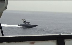 In a video released by the Navy's Bahrain-based 5th Fleet, a high-speed Guard Boghammar is seen turning head-on toward the Sirocco. The Sirocco repeatedly blows its horn at the Boghammar, which turns away as it closes in. The flare shot can be heard, but not seen, as the Boghammar passes the Sirocco with the Iranian flag flying above it.