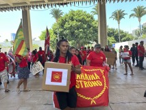 Several dozen people dressed in red T-shirts went to Green’s koa wood-paneled executive chambers to deliver the signatures in person. Green was not in his office, so his director of constituent services, Bonnelley Pa’uulu, accepted the box on his behalf. Altogether, 14,000 people signed the petition as of midday Tuesday.