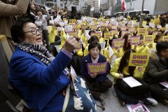 Tensions flared again in January when a South Korean court ruled that the Japanese government must give 100 million won ($90,000) to each of 12 women who sued in 2013 over their wartime sufferings. Japan insists all wartime compensation issues were settled under a 1965 treaty normalizing relations with South Korea.