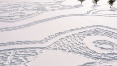 Under the guidance of local resident and amateur artist Janne Pyykko, 11 snowshoe-clad volunteers stamped a series of complex geometric patterns on a golf course. Together, the designs create a pattern with a starfish-resembling central figure surrounded by six huge snowflakes.