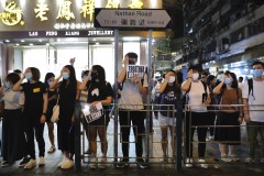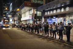 Some raised linked hands while others switched on their smartphone lights and held the devices aloft to create a row of white lights against the nighttime skyline. Organizers hoped the chains, which traced three subway routes, would total 40 kilometers (25 miles) in length.