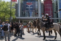 Outside the convention hall, hundreds of protesters gathered in a park where police set up metal barriers — some holding crosses with photos of the Uvalde shooting victims.