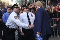 As Trump arrived, children climbed scaffolding around nearby buildings to get a better view. Trump shook hands with people standing behind police barricades before entering the bodega, where Plexiglas separates customers from the cash register.