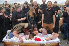 “I didn’t know Liza, but no person can go through this with calm,” priest Vitalii Holoskevych said, bursting into tears as Liza’s body lay in a coffin with flowers and teddy bears in the 18th-century Transfiguration Cathedral in Vinnytsia.
