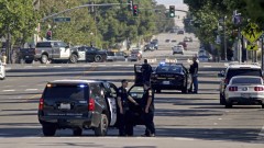 LOS ANGELES (AP) — Hundreds of California police officers were searching Thursday for a gunman suspected of opening fire at a police station, wounding a deputy with a shot to the face and killing a transient man.