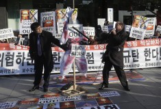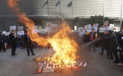 They burned an effigy of North Korean leader Kim Jong Un and cut apart the North Korean flag.