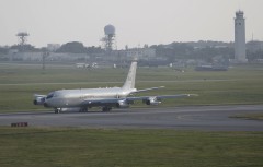 One of the aircraft seen departing, the RC-135S, collects optical and electronic data from ballistic targets. It is used for arms treaty compliance verification and U.S. strategic and missile defense development.