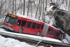 A large crack showed on the end of the bridge where the segmented bus landed 150 feet (46 meters) down in the ravine, as if hit by an earthquake. A car landed upside down in front of the bus, which was operated by the Pittsburgh area's transit agency.