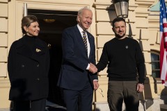 Biden, a Democrat, also got a short firsthand taste of the terror that Ukrainians have lived with for close to a year, as air raids sirens howled over the capital just as he and Zelenskyy were exiting the gold-domed St. Michael’s Cathedral, which they visited together. Looking solemn, they continued unperturbed as they laid a wreath and held a moment of silence at the Wall of Remembrance honoring Ukrainian soldiers killed since 2014.