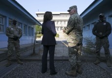 At the DMZ, Harris went to the top of a ridge, near guard towers and security cameras. She looked through bulky binoculars as a South Korean officer pointed out military installations on the southern side. Then an American officer pointed out some of the defenses along the military demarcation line, including barbed-wire fences and claymore mines. He said American soldiers regularly walk patrols along a path.
