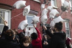 About a dozen mourners gathered in front of the apartment around noon Monday. They lit white prayer candles near the doorway of the building and released white, star-shaped balloons as music played and police shuffled in and out of the home.
