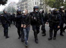 As marchers headed eastward and some pelted police with objects, police fired tear gas into the crowds, plumes of smoke filling the sky. A male protester was seen with a bleeding head and a police officer was carried away by colleagues. Three officers were injured, the French press quoted police as saying. Police, again responding to rowdy crowds, also turned a water cannon on protesters as the march ended at the Bastille.