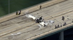 Drone video on social media showed the plane crumpled on the Haulover Inlet Bridge with a damaged SUV nearby. A man can be seen scrambling from the plane and being helped by others to the side of the roadway just before the aircraft became engulfed in flames.
