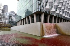 LONDON (AP) — Police in London arrested six people on Thursday after environmental activists from Greenpeace poured 300 liters (79 gallons) of blood-red dye into a pond in front of the U.S. Embassy in a protest against arms sales to Israel.