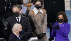 For Emhoff, the designers chose a long gray wool coat with fluffy embellishments on the shoulders, then a midnight navy leather trench-type coat, and finally a black pantsuit. Also walking in the virtual runway show is Meadow Walker, daughter of the late actor Paul Walker.