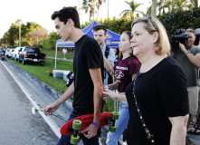 A long line of cars bringing people back to the school in Parkland, Florida is being guided by police as dozens of television trucks and vehicles camp out nearby.