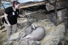 Once Winsol begins to feed, zookeeper Danielle Holste must quickly draw samples from one of Ali's available nipples without disturbing the hungry youngster. Staffers gently adjust the animals' positions to keep Ali from accidentally rolling onto Winsol. Drawing milk by hand, it takes only minutes to gather several milliliters for analysis.