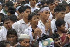 The refugees gathered in an open field at Kutupalong camp in Cox’s Bazar district carrying banners and festoons reading “Hope is Home” and “We Rohingya are the citizens of Myanmar,” defying the rain on a day that is marked as “Rohingya Genocide Day.”