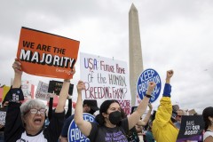 In the nation’s capital, thousands gathered in drizzly weather at the Washington Monument to listen to fiery speeches before marching to the Supreme Court, which was surrounded by two layers of security fences.