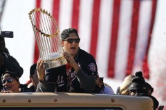 The crowd along the route was deeply packed. Cheers went up and fans waved red streamers, hand towels and signs that said "Fight Finished" as the players rode by on the open top of double-decker buses. General Manager Mike Rizzo, a cigar in his mouth, jumped off with the World Series trophy to show the fans lining the barricades and slap high-fives. Manager Dave Martinez also got in on the fun.