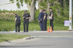 About a dozen police officers combed the area around the crash site looking for evidence Monday. Blue markers on the ground dotted the intersection.