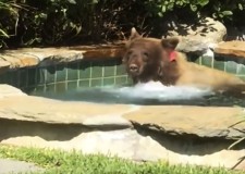 Hough recorded video of the bear lolling in the unheated hot tub with the jets on. The creature played with the chlorinator and tossed the thermometer in the air, Hough said.