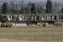 During the day, lines of Israeli tanks and buses were gathered near the border area as soldiers milled about. Late Monday, with roads in southern Israel all but empty, a flatbed truck carrying an armored vehicle made its way toward the border area.