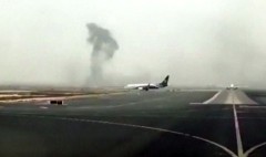 Video posted online showed black smoke billowing from what looked like an Emirates jetliner lying on its belly on the runway.