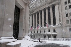 A pedestrian walks outside the New York Stock Exchange during a snow storm, Monday, Feb. 23, 2026, in New York. (AP Photo/Seth Wenig)   (Associated Press)