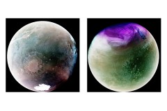 This combination of ultraviolet spectrum images provided by NASA shows atmospheric features of the planet Mars in July 2022, left, during the southern hemisphere’s summer season, and the planet’s northern hemisphere in January 2023 after Mars had passed the farthest point in its orbit from the Sun,...   (Associated Press)
