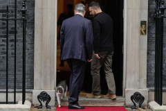 Britain's Prime Minister Keir Starmer welcomes Ukrainian President Volodymyr Zelenskyy to 10 Downing Street as Larry the cat, Chief Mouser to the Cabinet Office, steps out in London, Thursday, Oct. 10, 2024. (AP Photo/Alastair Grant, File)   (Associated Press)